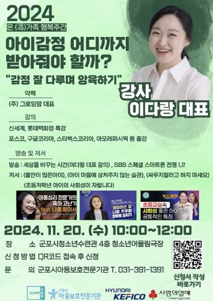 11월 20일 진행될 부모교육은 ㈜그로잉맘 이다랑 대표의 ‘아이감정 어디까지 받아줘야 할까?’라는 주제로 아이를 양육하는 부모들이 감정을 다스리며 양육하는 구체적인 방법에 대해 제시할 예정이며, 해당 교육을 통해 부모 양육역량을 강화하여 궁극적으로 군포시 내 아동학대예방 및 아동권리증진을 도모할 예정이다. 신청은 포스터에 QR코드를 통해 신청 가능하다. 또한 교육당일 현장에서는 아동학대예방캠페인(아동학대 STOP 권리 UP)도 동시에 진행 될 예정이다