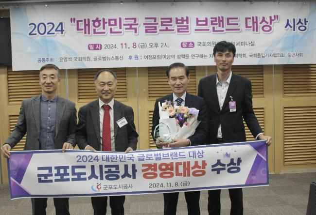 (뉴스폼) 군포도시공사가 지난 8일 국회의원회관에서 열린 ‘2024 대한민국 글로벌브랜드 대상’에서 경영대상을 수상하는 영예를 안았다.