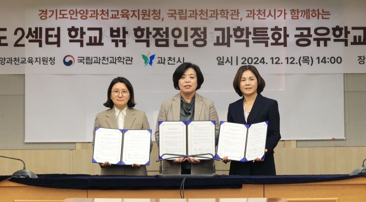 (뉴스폼) 과천시는 지난 12일, 시청 상황실에서 한형주 국립과천과학관장, 이승희 안양과천교육지원청 교육장과 ‘학점인정 과학특화 공유학교 업무협약’을 체결했다.