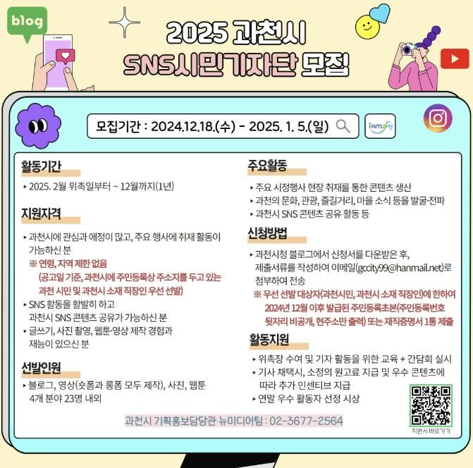 (뉴스폼) 과천시는 시민의 시선으로 과천의 매력과 시정소식을 생생하게 전달할 ‘2025 과천시 SNS시민기자단’을 오는 2025년 1월 5일까지 공개 모집한다.
