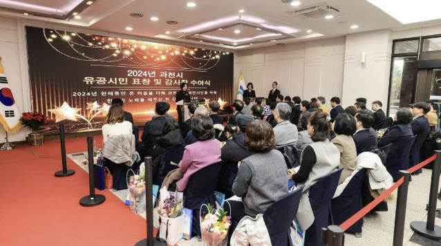 (뉴스폼) 과천시는 20일 시청 로비에서 '2024년 유공시민 표창 및 감사장 수여식'을 열어 지역사회 발전과 복리 증진에 기여한 시민과 기관·단체를 격려했다.