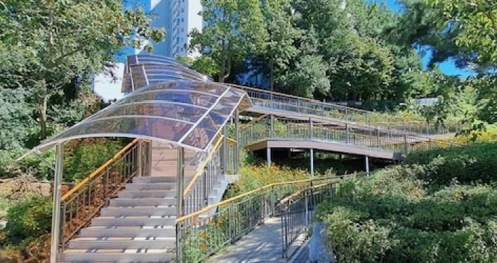 진입로엔 보행 안전을 위해 차양막, 경관등 등을 추가했고, 유모차와 휠체어도 이동할 수 있도록 이동경사로를 설치했다.