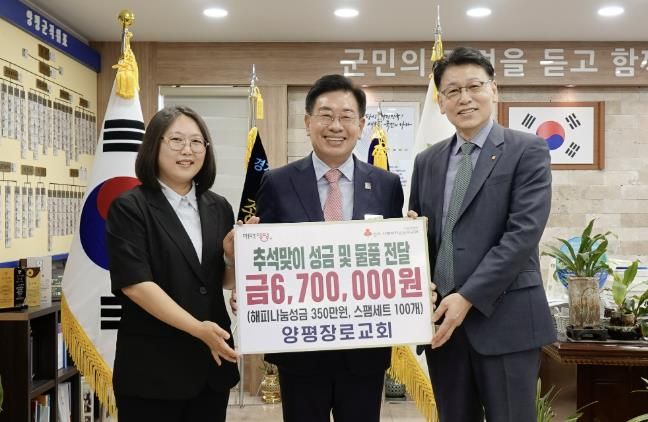(뉴스폼) 양평군은 지난 23일 양평장로교회가 추석 명절을 맞아 어려운 이웃을 돕기 위해 320만 원 상당의 스팸세트 100개와 해피 나눔 성금 350만 원을 기탁했다고 밝혔다.