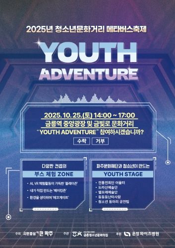 (뉴스폼) (재)파주시청소년재단 금촌청소년문화의집은 오는 2025년 10월 25일 토요일 금릉역 중앙광 및 금빛로 문화거리 일대에서 2025년 청소년문화거리메타버스축제 ‘YOUTH ADVENTURE’를 개최한다고 밝혔다.