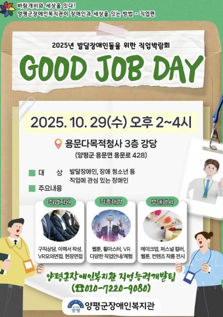 (뉴스폼) 대한불교조계종사회복지재단이 운영하는 양평군장애인복지관은 오는 29일 오후 2시부터 4시까지 용문다목적청사 3층 강당에서 발달장애인의 직업 탐색 기회를 지원하기 위한 직업박람회 ‘GOOD JOB DAY’를 개최한다.