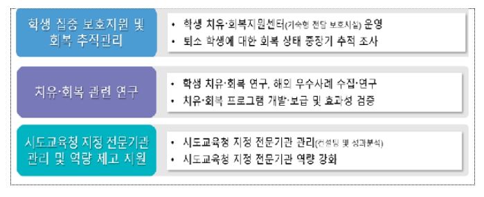 현행 '학교폭력예방법'은 학생 치유·회복 지원기관을 지정하거나 설치·운영할 수 있는 권한을 시도교육감에게 부여하고 있다. 이에 근거하여 현재 17개 시도교육감은 303개(2023.2월 기준)의 학교폭력 피해학생을 위한 치유·회복 지원기관을 지정 또는 설치·운영하고 있다. 그러나 시도교육감이 지정한 지원기관의 역량을 체계적으로 지원하고, 국가 수준에서 학교폭력 및 사회·정서 문제 등에 전문적으로 대응하는 체계는 부족한 상황이다.