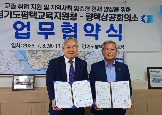 이번 업무협약은 직업계고등학교 학생의 취업 지원에 대한 상호 협력을 위한 것으로 이종민 평택교육지원청 교육장과 이보영 평택상공회의소 회장이 협약서에 서명했다.