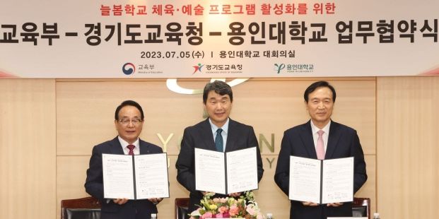 이번 협약식은 교육부, 경기도교육청, 용인대가 지역과 연계한 학교체육과 예술교육을 활성화하고 다양한 늘봄학교 운영을 지원하기 위해 체결했다. 이주호 사회부총리 겸 교육부 장관, 한진수 용인대 총장 등이 참석했다.