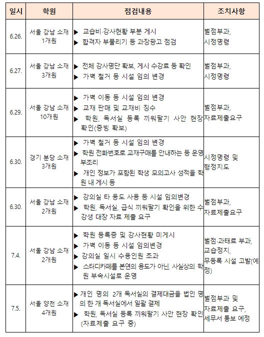 지난 7월 3일에는 일부 대형 입시학원의 10건의 허위·과장 광고에 대해 공정거래위원회 조사를 요청했으며, 이번 7월 7일에는 추가로 5건의 공정거래위원회 조사 요청이 이루어진다. 아울러, 교육부와 시도교육청은 6월 26일부터 신고 사안을 중심으로 25개 학원에 대한 합동점검을 실시하여 수강생 초과 수용을 위한 임의 시설변경, 교습비 게시 의무 위반 등을 적발하고 벌점‧과태료 부과, 시정명령 및 교습정지, 고발 등 엄정한 조치를 취했다.