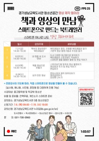 먼저, 영상 동아리는 7월 21일부터 8월 9일까지 ‘책과 영상의 만남’을 주제로 시립도담태평동 지역아동센터와 연계해 키네마스터 어플리케이션 배우기, 북트레일러 영상 제작 및 시사회 등으로 진행된다.
