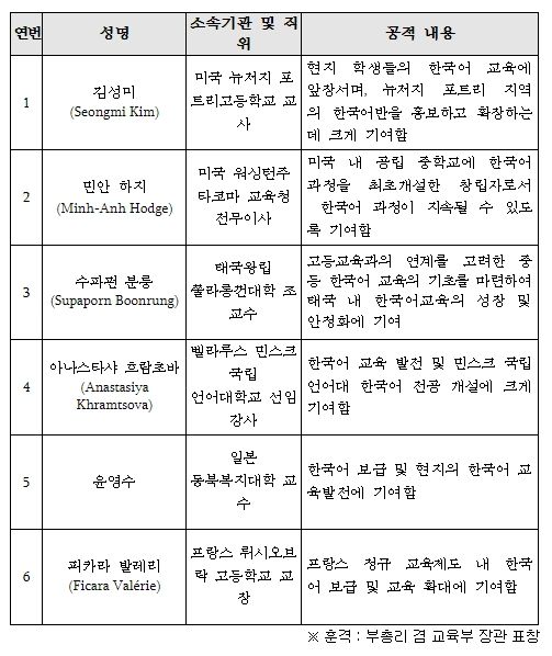 유공자에는 미국 공립학교 최초로 베이커중학교에 한국어 과정이 개설되도록 기여한 ‘민안 하지’ 워싱턴주 타코마교육청 전무이사, 벨라루스 민스크국립언어대에서 한국어가 전공 과목으로 격상될 수 있도록 애쓴 ‘아나스타샤 흐람초바’ 민스크국립언어대 강사 등 총 6명이 선정됐다.