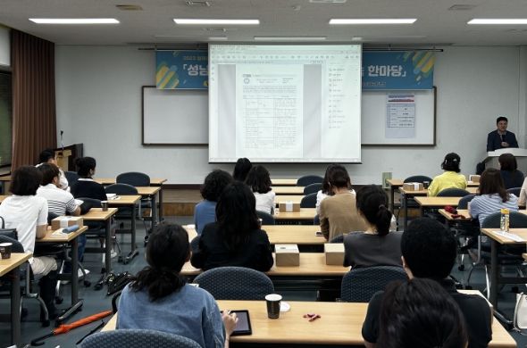 7월 15일 토요일 새마을중앙연수원에서 펼쳐진 수업 한마당은 총 2부로 운영됐으며, 1부에서는 서울대학교 하민수 교수의 비지도기반 AI서술형 평가 기반 실천 사례 강의와 질의응답을 하는 시간을 통해 AI 채점 모델, 학생 동료 평가를 지원하는 웹 시스템 및 AI를 활용한 서술형 평가에 접목해 단위학교에서 서・논술형 평가를 적극 활용할 수 있는 운영 사례에 대해 이야기 하는 시간을 가졌다.