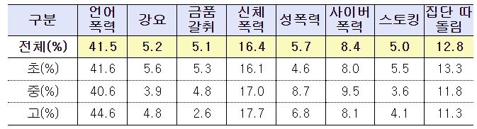 (뉴스폼) 교육부는 16개 시도교육청(전북교육청 자체 추진)이 2022년 9월 19일부터 10월 18일까지 실시한 2022년 2차 학교폭력 실태조사(표본조사) 결과 학교폭력 피해응답률 1.6%, 가해응답률 1.7%, 목격응답률 4.5%로 나타났다고 밝혔다.