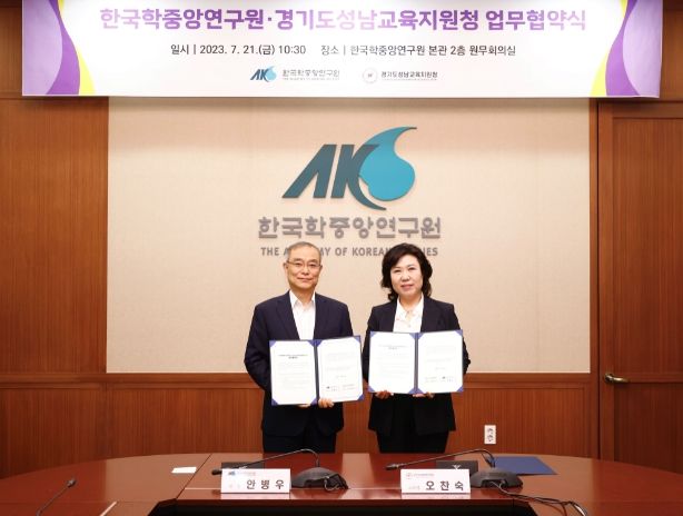 (뉴스폼) 성남교육지원청과 한국학중앙연구원은 7월 21일 한국학중앙연구원에서 성남 관내 학교의 기록문화유산 이해와 인문사회 교육 발전의 협력을 모색하기 위한 MOU를 체결했다.