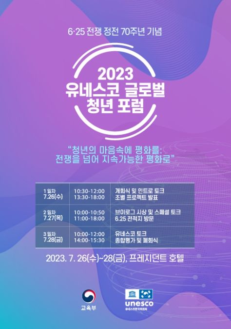 (뉴스폼) 교육부는 유네스코한국위원회와 함께 ‘2023 유네스코 글로벌 청년 토론회(포럼)’를 7월 26일부터 28일까지 3일간 서울 프레지던트 호텔에서 개최한다.