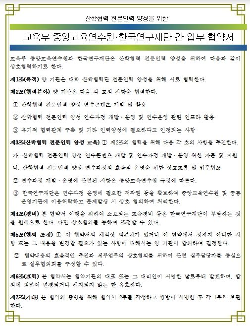 (뉴스폼) 교육부는 7월 28일, 교육부 중앙교육연수원(원장 홍민식)과 한국연구재단(이사장 이광복)이 대학 산학협력 전문인력 양성을 위한 업무협약을 체결한다고 밝혔다.