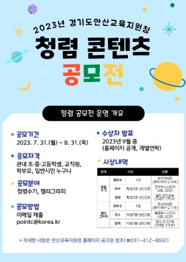 (뉴스폼) 경기도안산교육지원청은 8월 한 달간 ‘2023년 청렴 콘텐츠 공모전’을 개최한다고 밝혔다.