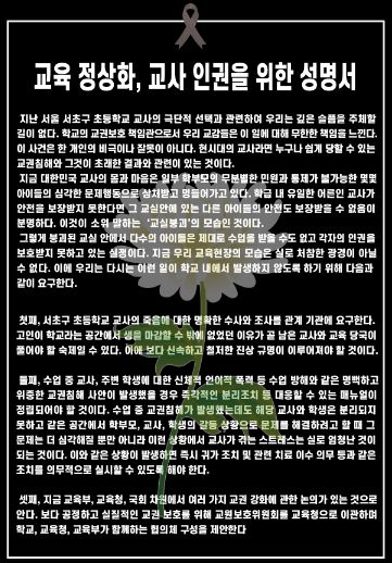 마지막으로 협의회는 “교사의 인권이자 교사로서의 권리, 이 교권의 추락은 곧 교육의 추락으로 이어지고, 교권이 무너진 학교에서 도대체 무엇을 가르칠 수 있냐?”며, “정상적인 교육 환경을 조성하고 죽은 교육을 살려야 한다”고 말했다.