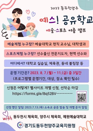 (뉴스폼) 동두천양주교육지원청은 8월 7일부터 8월 11일까지 일주일간 예원예술대학교, 동두천시체육회, 양주시체육회와 함께하는 ‘예스! 공유학교’(예술·스포츠 여름 캠프)를 초·중학교 300여 명의 학생들을 대상으로 운영한다.