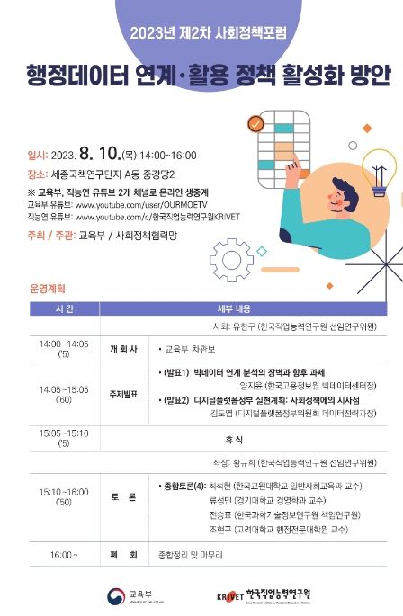 (뉴스폼) 교육부는 한국직업능력연구원 등 사회정책협력망 연구기관들과 함께 ‘행정데이터 연계·활용 정책 활성화 방안’을 주제로 8월 10일, 세종국책연구단지에서 제2차 사회정책 공개토론회를 개최한다.
