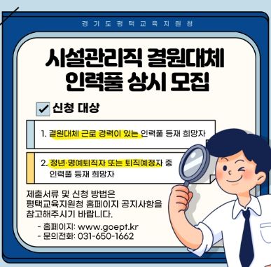 지방공무원 결원대체 채용 공고 및 시설관리직 대체인력 인력풀 등록 안내에 관한 자세한 사항은 평택교육지원청 홈페이지에서 확인할 수 있다.