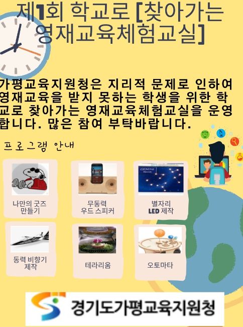 『찾아가는 영재교육 체험 교실』 프로그램은 “나만의 굿즈, 무동력 우드 스피커, 별자리 액자, 동력 비행기 제작, 테라리움 LED 모스 비단 이끼, 지구와 달 오토마타”로 총 6개로 기획·운영하여 가평 관내 초등학생들에게 관심이 있는 분야의 영재교육에 대한 기회를 제공함으로써, 창의적 사고력을 높일 수 있는 기회를 제공하고자 한다.
