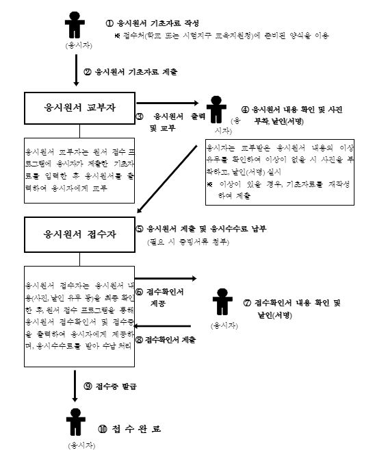 현재 고등학교에 재학 중인 졸업예정자는 해당 학교에서 일괄 접수하고, 고등학교 졸업자는 출신 고등학교에서 접수한다. 단, 고등학교 졸업자 중 현재 주민등록상 주소지와 출신 고등학교 소재지의 관할 시험지구가 서로 다르거나, 현재 주민등록상 주소지와 출신 고등학교 소재지가 동일 시험지구 내 서로 다른 관할 행정구역에 속할 경우(도의 시‧군만 해당)에는 현재 주민등록상 주소지의 관할 시험지구 교육지원청에서도 접수할 수 있다.