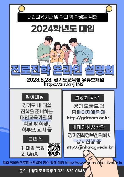 (뉴스폼) 경기도교육청이 대안교육기관, 학교 밖 학생의 2024학년 대입 준비 지원을 위해 온라인 진로 진학 설명회를 개최한다.