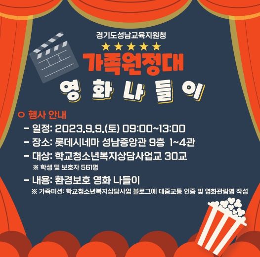 (뉴스폼) 경기도성남교육지원청은 9일 성남교육지원청 학교청소년복지상담사업 공동프로그램인 ‘가족원정대’활동으로 환경 보호 영화 나들이를 진행한다.