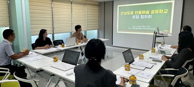 이날 안성교육지원청, 안성시청, 중앙대학교 담당자 및 공유학교 주강사와 길잡이교사로 구성된 안성맞춤 전통예술 공유학교 운영 협의회에서는 ▲ 경기공유학교 및 안성형 공유학교 정책 안내 ▲ 안성맞춤 전통예술 공유학교 중장기 계획 ▲ 2023 공유학교별 협의 및 내용 공유 ▲ 업무협약(안) 협의 등의 진행을 통해 안성맞춤 전통예술 공유학교의 운영 방향과 교육 프로그램 개발, 지속가능한 공유학교 운영에 대한 다양한 의견을 나누었다.