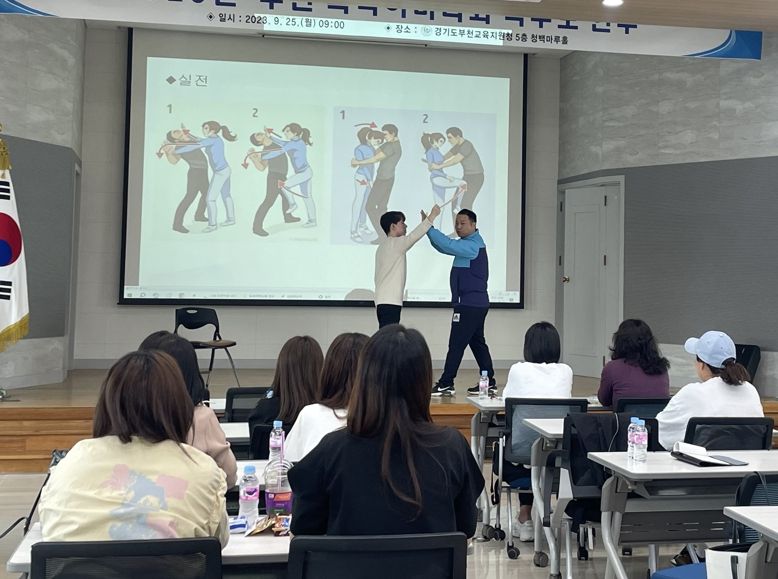 (뉴스폼) 경기도부천교육지원청은 안전한 학교문화 조성을 위해 9월 25일(월) 관내 초등학교 학부모를 대상으로 호신술 및 교통안전 연수를 실시했다.