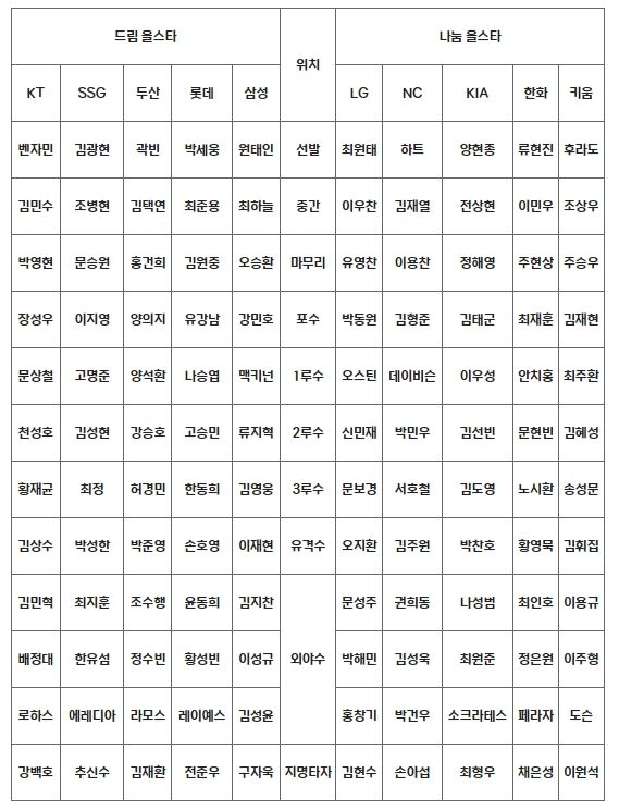 명단은 해당 구단에서 추천한 포지션별 1명씩(투수는 선발, 중간, 마무리 각각 1명씩 총 3명)의 선수로 구성돼 구단 당 12명, 총 120명의 선수가 후보에 올랐다.