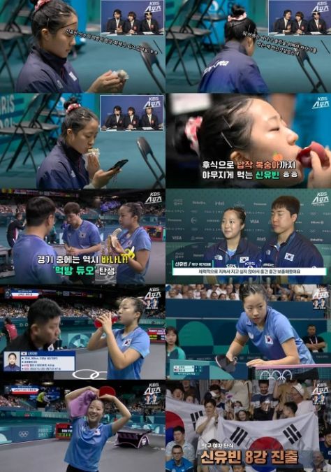 앞서 30일 혼합복식 동메달 결정전에 앞서 ‘주먹밥과 납작복숭아’를 섭취한 신유빈은 경기 중 타임아웃 때 ‘바나나 먹방’을 펼쳐 화제를 모았다. 김진웅 캐스터는 “어제는 바나나 플릭을 위해서 바나나 먹는 게 아닌가 싶었는데...”라고 너스레를 떨었다. 이에 대해 신유빈은 “주먹밥은 엄마가 싸주신 거였다. 체력적으로 지쳐서 지고 싶지 않았기 때문에 중간중간 보충해준 것”이라고 설명했다.