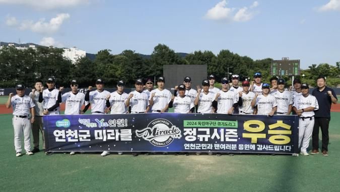 (뉴스폼) 독립야구단 연천군 미라클이 ‘2024 독립야구단 경기도리그’ 정규시즌 우승 했다.연천은 개막부터 단 하루도 1위에서 내려오지 않은 “와이어 투 와이어“ 우승으로 19일부터 진행 되는 챔피언 결정전에 직행했고 지난해 통합 우승에 이어 3년 연속 챔피언에 한 발짝 다가섰다.