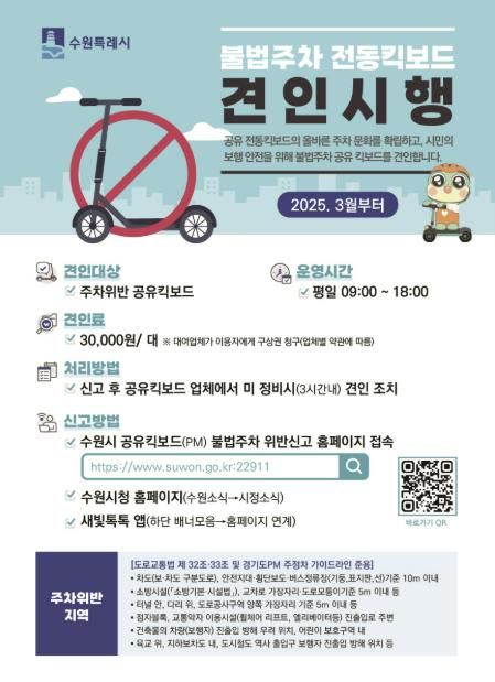 수원시 관계자는 “보행자의 안전을 확보하고, 전동킥보드를 질서 있게 주차하는 문화가 조성되도록 유도하겠다”며 “공유 모빌리티 활성화를 위한 기반을 조성하기 위해 노력하겠다”고 밝혔다.