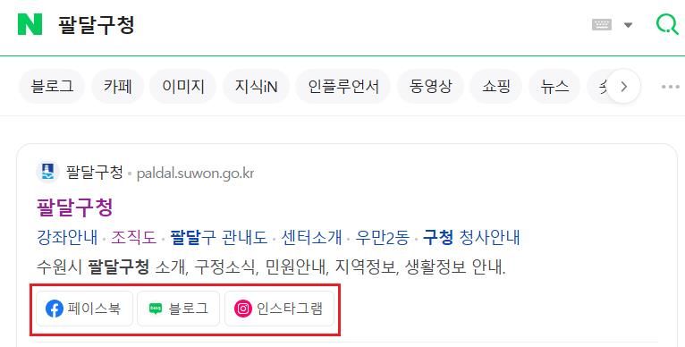또한 SNS를 따로 하지 않더라도 네이버 블로그를 개설하여 네이버에 관련 내용을 검색하면 블로그 내용이 검색되는 등 정보 접근성을 높였다. 나아가 네이버 포털에 ‘팔달구청’을 검색하면 구청 홈페이지 아래 관련 SNS 채널이 함께 팝업되어 손쉽게 접근할 수 있도록 했다.