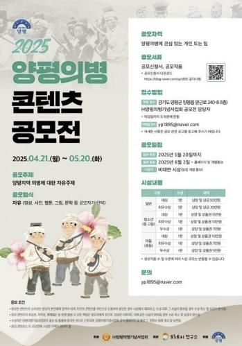 (뉴스폼) (사)양평의병기념사업회는 양평 지역 의병의 역사와 정신을 되새기고, 이를 현대적으로 재해석한 콘텐츠를 발굴하기 위해 오는 21일부터 ‘2025 양평의병 콘텐츠 공모전’을 개최한다고 밝혔다.