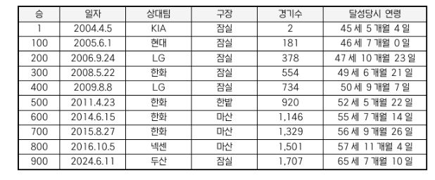 2024시즌 중 한화 감독에 선임되며 KBO 리그에 복귀한 김경문 감독은 2024년 6월 11일 잠실 두산전에서 자신의 통산 900번째 승을 달성한 바 있다.