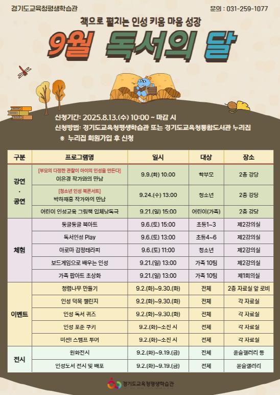 9월 2일부터 30일까지 운영되는 이번 프로그램은 인성교육의 핵심 덕목인 배려, 공감, 책임 등을 주제로 학생 및 학부모에게 책과 연계한 인성교육의 기회를 제공하기 위해 마련됐다.