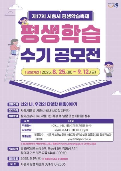 (뉴스폼) 시흥시는 시민들의 배움과 성장의 경험을 제17회 시흥시 평생학습축제를 통해 공유하고자 '시흥시 평생학습 수기 공모전'을 개최한다. 이번 공모전은 평생학습을 통해 변화와 성장을 경험한 시민들의 이야기를 발굴하고, 학습 문화를 확산하는 데 목적이 있다.