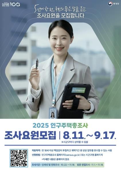 (뉴스폼) 의왕시는 오는 10월 22일부터 11월 18일까지 실시되는 ‘2025 인구주택총조사’에 참여할 조사요원 67명을 모집한다고 밝혔다.