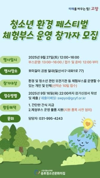 (뉴스폼) 고양시청소년재단 송포청소년문화의집은 청소년들이 일상에서 환경의 소중함을 배워가는‘2025 청소년 환경 페스티벌’참가자를 모집한다고 밝혔다.