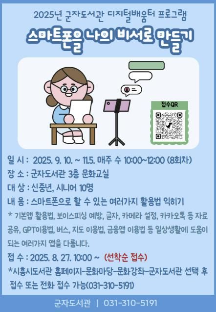 (뉴스폼) 시흥시 군자도서관은 디지털 환경에 익숙하지 않은 신중년, 어르신 세대를 대상으로 ‘스마트폰을 나의 비서로 만들기’ 디지털배움터 프로그램을 오는 9월 10일부터 운영한다.
