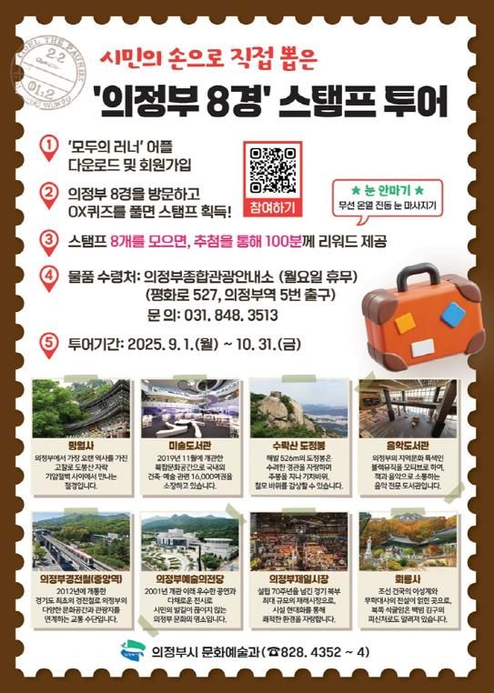 (뉴스폼) 의정부시는 9월 1일부터 10월 31일까지 2025년 하반기 ‘의정부8경 스탬프투어’를 개최해 시민과 관광객을 맞이한다.