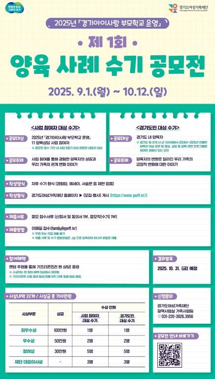 선정 결과는 10월 중 경기도여성가족재단 누리집을 통해 발표되며, 수상작은 향후 사례집 제작 등 아이사랑 부모학교 사업 홍보에 활용될 예정이다.
