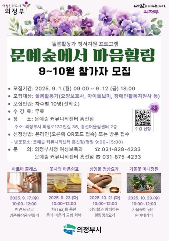 (뉴스폼) 의정부시는 9월 1일부터 돌봄활동가를 위한 정서 지원 프로그램 ‘문예숲에서 마음힐링’의 9~10월 참가자를 모집한다.
