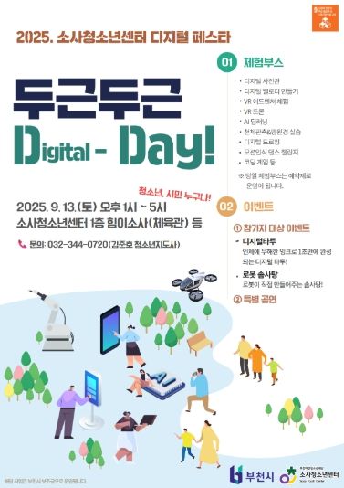 이 날 9월 13일 오후 1시부터 5시까지 소사청소년센터 실내에서는 디지털 페스타가 진행되며 참가는 청소년, 청년, 지역 주민 등 누구나 가능하며 사전 신청 없이 당일 현장에서 자유롭게 참여할 수 있다.