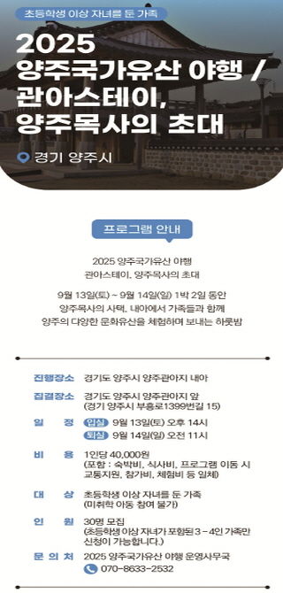 (뉴스폼) 양주시가 ‘2025 양주국가유산 야행’ 주제(8夜) 가운데 하나인 ‘야숙(夜宿)’ 프로그램에 대한 참가자를 모집한다고 29일 밝혔다.