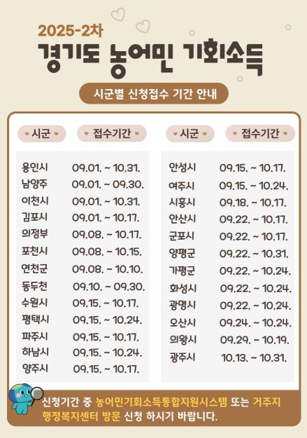 신청은 9월부터 10월까지 시군별 일정에 따라 읍면동 행정복지센터에 방문하거나, ‘경기도 농어민 기회소득 통합지원시스템’을 통해 온라인으로 신청하면 된다.