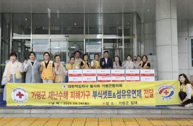 (뉴스폼) 대한적십자사 가평군협의회는 최근 집중호우로 피해를 입은 가평군 내 수해 가구를 위해 2천만 원 상당의 부식 세트와 섬유유연제를 기탁했다.